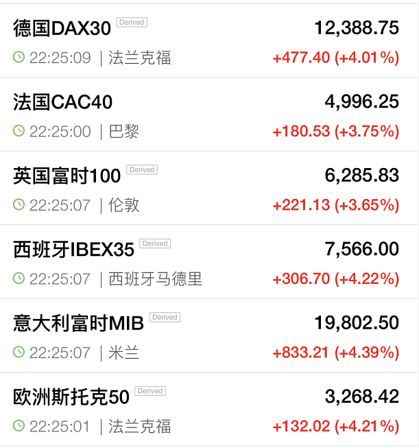 欧洲股市同样也出现大涨,德国DAX30涨逾4%,法国CAC40、英国富时100涨逾3.5%,欧洲斯托克50涨逾4%。