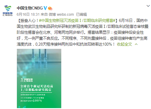 6月16日,中国生物在其官微发布消息,中国生物武汉生物制品研究所研制的新冠病毒灭活疫苗Ⅰ/Ⅱ期临床试验盲态审核暨阶段性揭盲会在北京、河南两地同步举行。