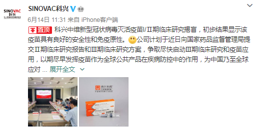 与此同时,6月14日,科兴生物也在其官微上发布了旗下科兴中维新型冠状病毒灭活疫苗I/Ⅱ期临床研究揭盲结果。截至目前,I/Ⅱ期临床研究受试者共743人已全部完成接种,现有数据显示疫苗具有良好的安全性与免疫原性。