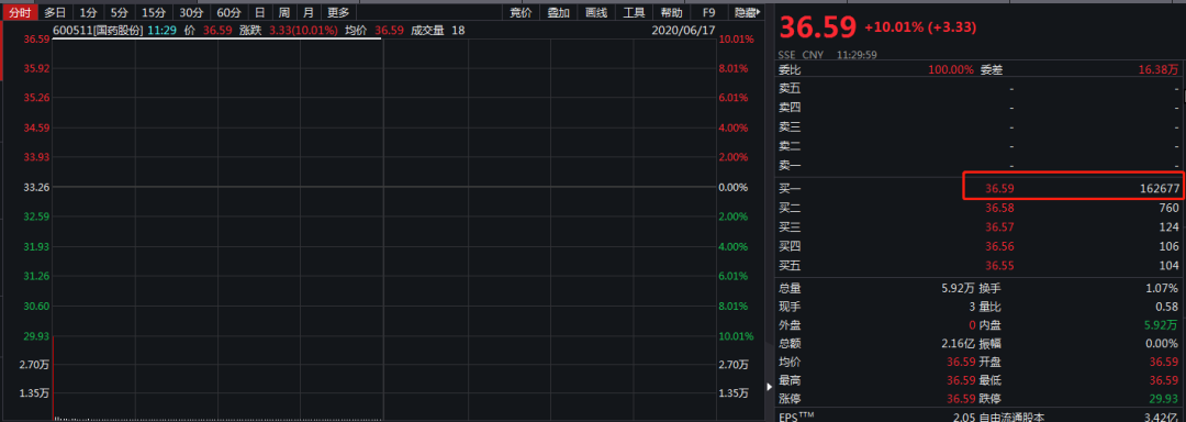 当天上午,国药股份强势一字涨停,截至午盘收盘,股价报收36.59元,超16万手仍然封在涨停板上。