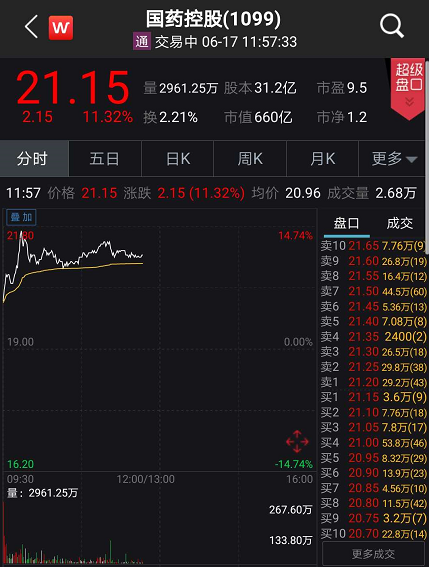 6月17日早盘,A股国药股份开盘后股价一字涨停,港股国药控股更是涨超14%以上。
