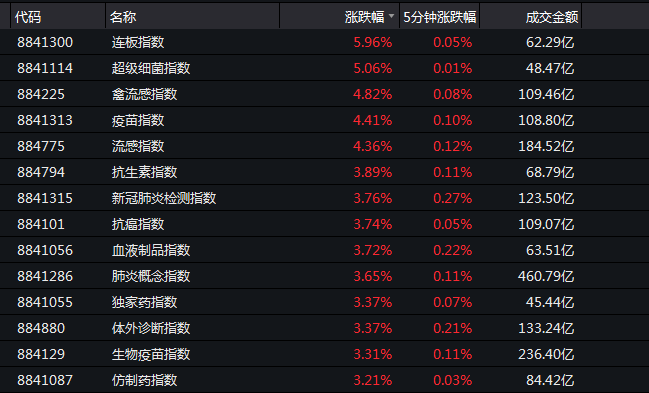 盘面上,生物疫苗指数强势上攻,盘中一度涨超4%以上,新冠肺炎检测指数、超级细菌指数、流感指数、抗生素指数等相关题材集体大涨,医药股更是全面爆发。