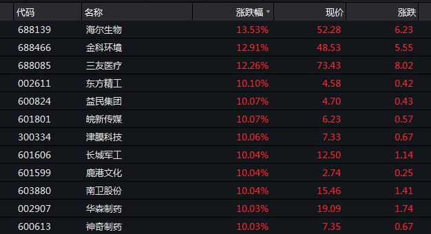 从当天个股表现看,科创板公司海尔生物、金科环境、三友医疗等涨超12%,神奇制药、华森制药、宝莱特、中新药业等个股强势涨停。