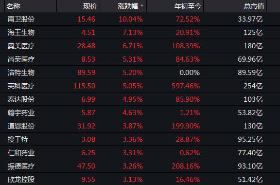 板块内,南卫股份涨停,海王生物、奥美医疗、尚荣医疗、洁特生物等涨超5%以上。