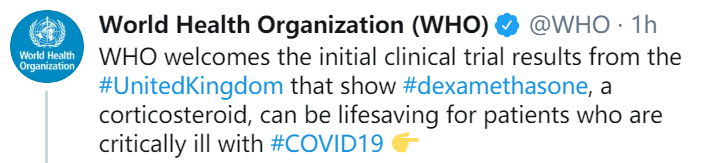 世卫组织总干事谭德塞表示,这是第一种可降低需吸氧或使用呼吸机的新冠肺炎患者的死亡率的治疗方法,这是个好消息,祝贺英国政府、牛津大学以及为这一突破作出贡献的医院和患者。