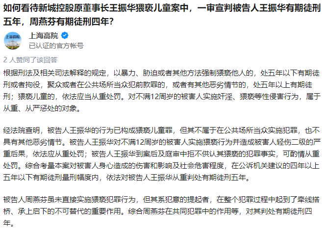 为什么只判了5年?上海高院回答称,经法院查明,被告人王振华的行为已构成猥亵儿童罪,但其不属于在公共场所当众实施犯罪,也不具有其他恶劣情节。被告人王振华对不满12周岁的被害人实施猥亵行为并造成被害人轻伤二级的严重后果,依法应从重处罚;被告人王振华到案后及庭审中拒不供认其猥亵的犯罪事实,可酌情从重处罚。综合考量本案对被害人身心造成的伤害和影响及社会危害程度,在公诉机关建议的四年以上五年以下有期徒刑量刑幅度内,依法对被告人王振华从重判处有期徒刑五年。