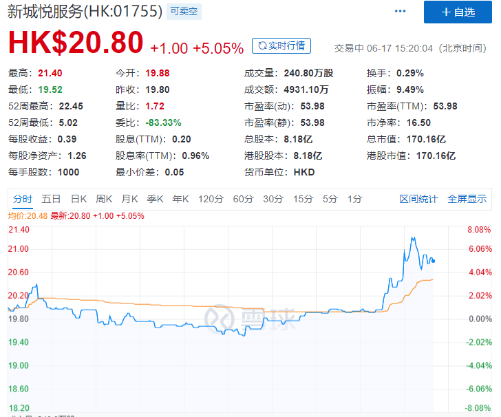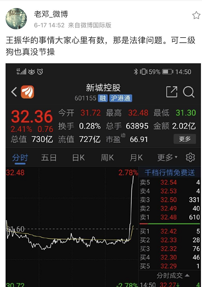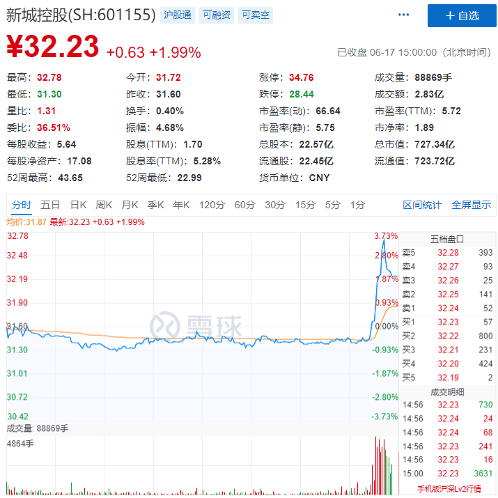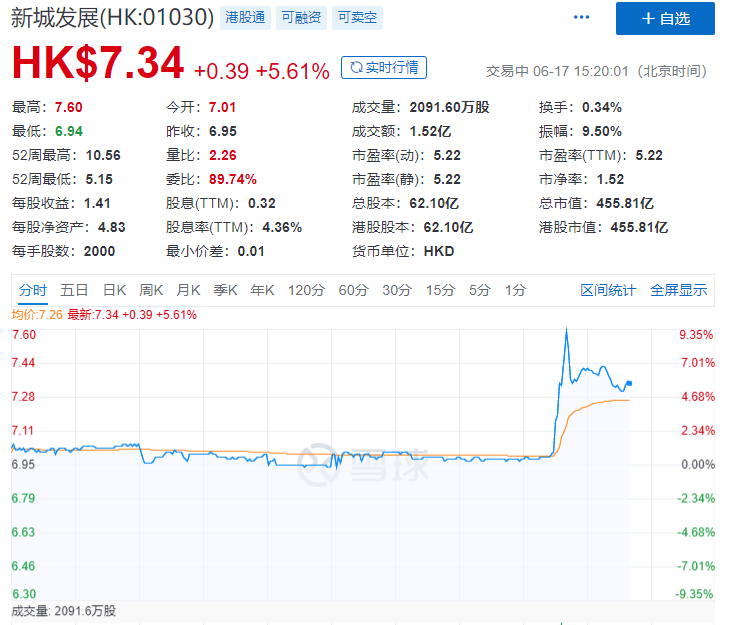 消息宣布之后,新城控股股价直线拉升,一度涨超3%,随后涨幅收窄,收涨1.99%