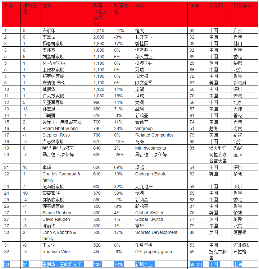 今年,王振华和其子王晓松在胡润全球房地产富豪榜中位列第33名,相比去年上升34名;身价430亿元,相比去年财富增长74%。