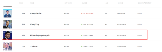 根据福布斯富豪排行榜实时数据,刘强东最新身家132亿美元(约人民币924亿元),排名中国富豪榜18位,全球富豪榜121位。