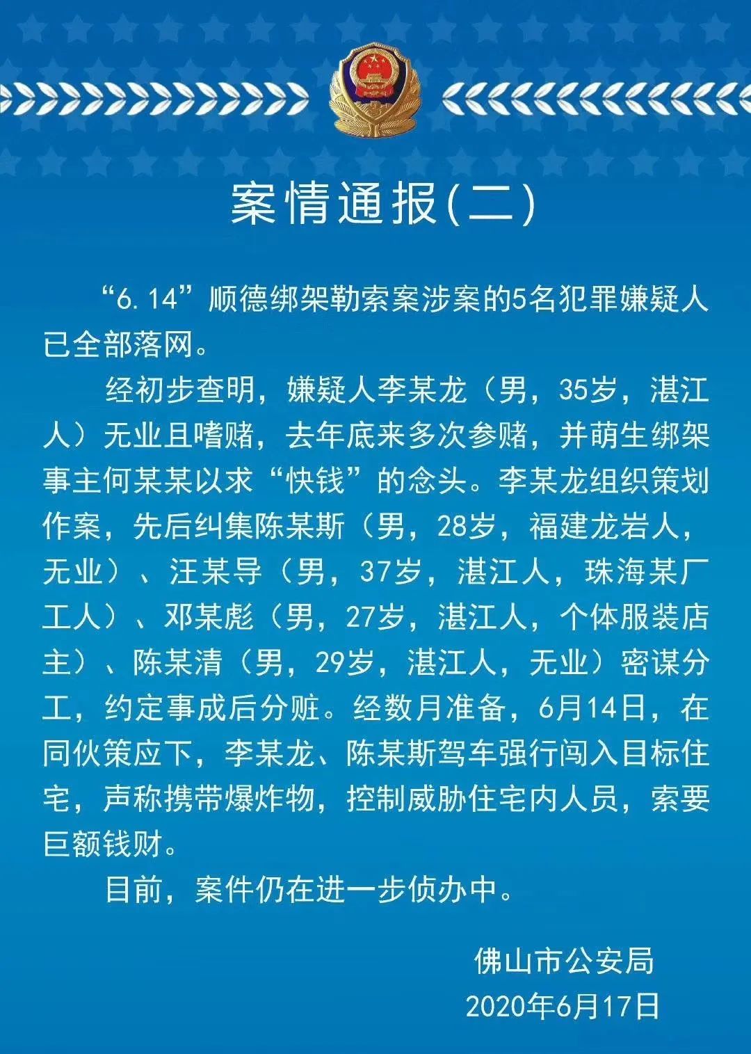 6月15日,佛山市公安局官微发布消息称,6月14日17时30分许,佛山110接报警,顺德区北渭镇美的集团君兰生活村一住宅有外人闯入,威胁住宅内人员人身安全。6月15日5时许,民警已抓获5名涉案犯罪嫌疑人。事主何某某安全。
