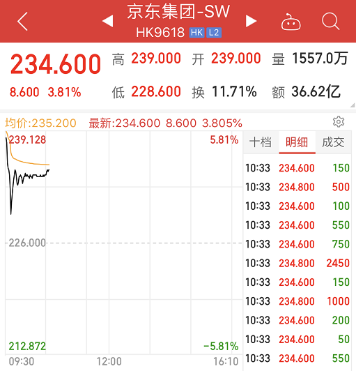 6月18日,京东集团在港交所正式挂牌交易,上市代号为“9618”,此次发售了1.33亿股A类普通股。