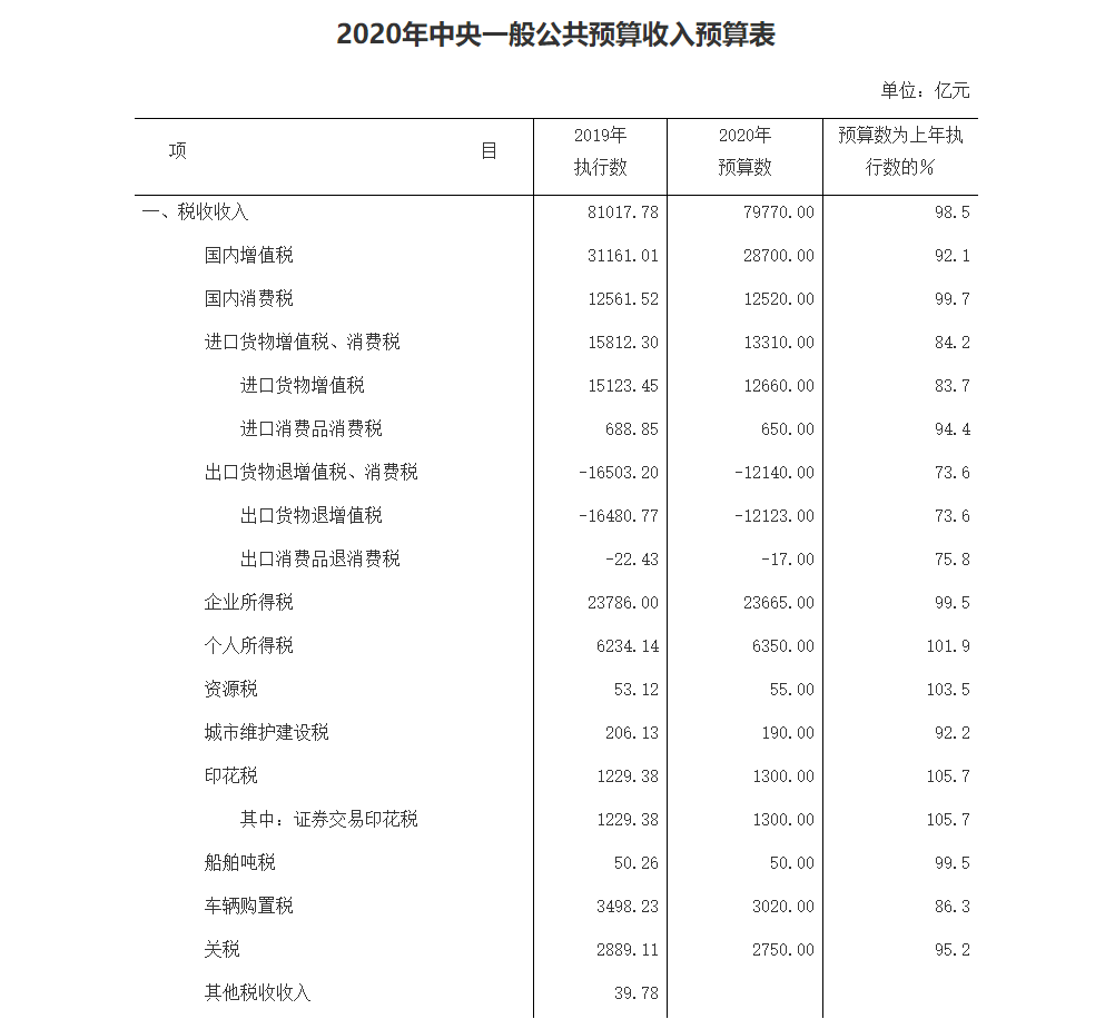 据2020年中央一般公共预算收入预算表,税收收入预算数占79770亿元,比上年执行数下降1.5%。除个人所得税预算、资源税预算、证券交易印花税预算出现增长外,今年其他税收收入预算都有所下降。