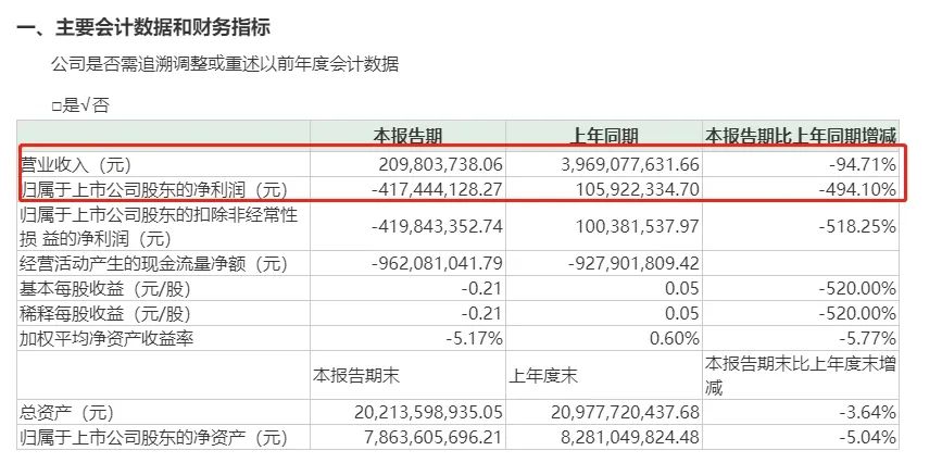 虽然2019年年报尚未正式发布,但公司2020年一季报还是在4月底披露了,仍然是亏损。今年一季度,营业收入仅为2.1亿元,暴降94.71%;净利润亏损4.17亿元,而去年同期为盈利1.05亿元。