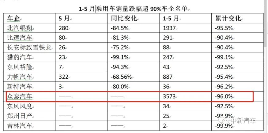 今年前5个月,力帆汽车、众泰汽车等车企销量跌幅却超过了90%,远远差于行业平均22%的跌幅。众泰汽车已经多月未公布产销数据,根据媒体报道未经官方确认的数据显示,众泰汽车今年前5个月销量为3573辆,同比下滑96%。