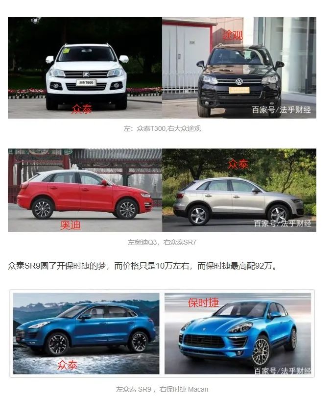 山寨之路走向高潮。众泰的王牌产品-T600,模仿大众途锐,2015年销量达到11.05万台,2016年末,众泰SR9“闪闪发光”,外观与保时捷Macan高度相似;据说刚上市三天,订单就突破2万,一车难求,要加价才能提车!2016年,众泰汽车累计销量达到33.31万辆,同比增长50%。