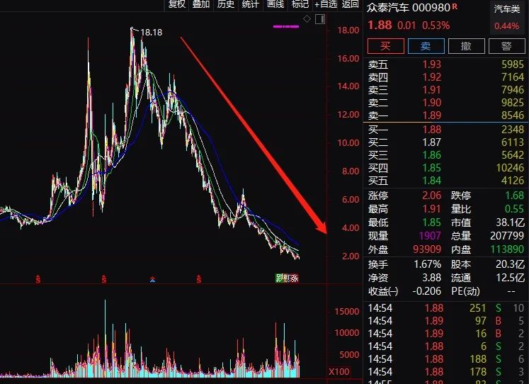 在当年借壳利好下,2016年12月众泰汽车(当时金马股份)股价高位为18.18元(前复权),而最新收盘价仅为1.88元,高位至今股价跌去89.66%。