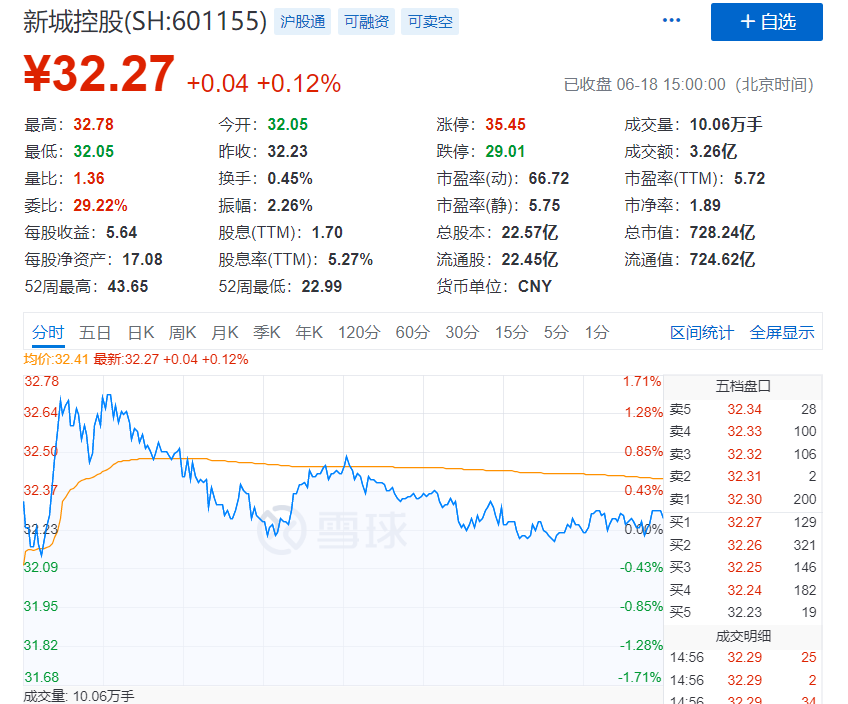 截至18日收盘,新城控股股价收盘报32.27元/股,涨幅0.12%;新城发展股价报7.36港元/股,上涨0.82%。