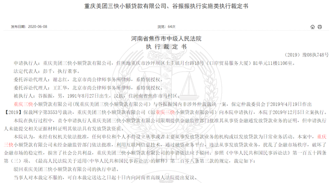 中国裁判文书网近日公布的多份裁定书显示,重庆美团三快小额贷款有限公司(原重庆三快小额贷款有限公司,下称“重庆小贷”)向河南省焦作市中级人民法院(下称“焦作中院”)申请执行仲裁裁决,反被焦作中院判定“违法从事发放贷款业务”,并驳回其执行申请。
