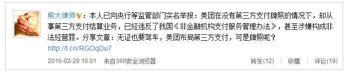 “无牌经营”解决不久,美团支付业务再次被律师举报违规。2017年8月,北京裕仁律师事务所发布微博称,“近日,由我所张亮律师代理的举报美团网涉嫌非法经营支付业务一案,中国支付清算协会已经受理立案,目前正在调查中。美团网的代收代付款业务无证经营,已经违反了《非金融机构支付服务管理办法》、《非银行支付机构网络支付业务管理办法》等法律法规。”