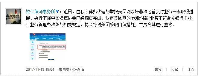 2017年11月13日,裕仁律师事务所再次通过微博发布消息称,“央行下属中国支付清算协会针对美团网‘代收付款’业务不符合《银行卡收单业务管理办法》的相关规定,协会将对美团采取自律措施,并责令美团进行整改。”