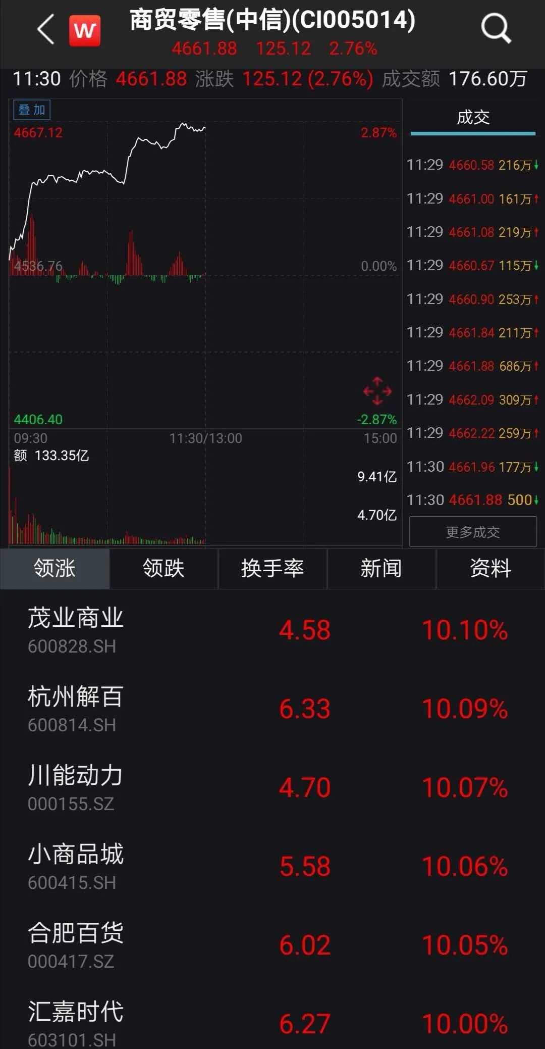 今日早盘商贸零售板块集体拉升,截至上午收盘,茂业商业、合肥百货、锦和商业、汇嘉时代 纷纷涨停。