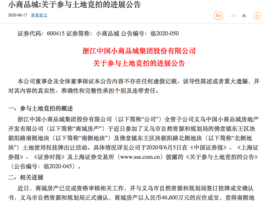 事实上,随着2018年房产项目集中交付且存量楼盘销售下降,小商品城的房产业务收入占比逐步降低。去年,公司房产收入占营收的比例由2017年的67%降至16%。而推动公司向国际贸易综合服务商转变,市场向数字贸易转型,是小商品城接下来主要的努力方向。小商品城此次剥离房地产板块,主要是为聚焦市场主业,推动各类资源要素向主业集中。