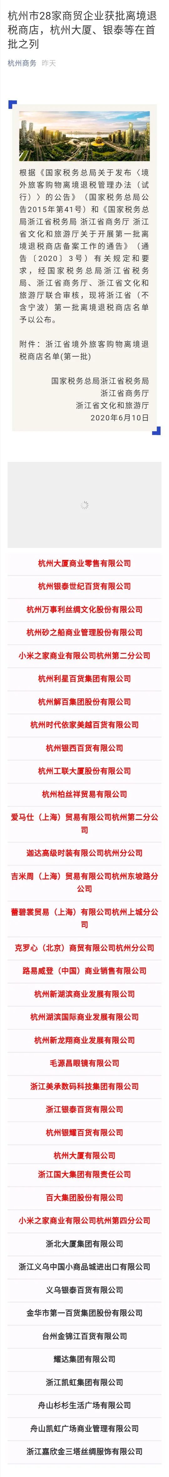 据杭州市商务委员会官微,国家税务总局浙江省税务局、浙江省商务厅、浙江省文化和旅游厅日前公布浙江省(不含宁波)第一批离境退税商店名单。杭州大厦商业零售有限公司、杭州银泰世纪百货有限公司、百大集团股份有限公司、杭州解百集团股份有限公司、浙江嘉欣金三塔丝绸服饰有限公司等多家公司在列。