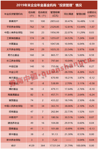 而最新获得投资管理资质的人保养老、新华养老,投管业务也有进展。人保养老的投资管理资质由人保资产迁移而来,2019年末的企业年金投管规模364亿,管理组合数99个,与2018年相比(含人保资产),规模增长38%,组合数增加34个。新华养老投资管理规模7.22亿元,管理3个组合,与2018年相比,实现了零的突破。