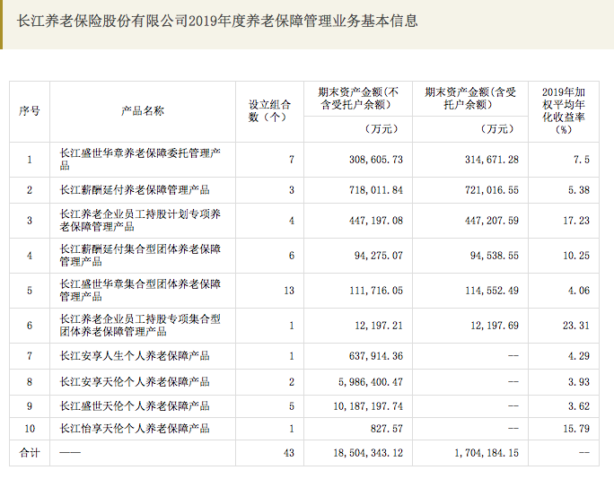 长江养老2019年底的团体和个人养老保障管理产品规模约1850亿元,主要是个人业务:共推出4只个人养老保障管理产品,设立组合数9个,规模约1680亿元。