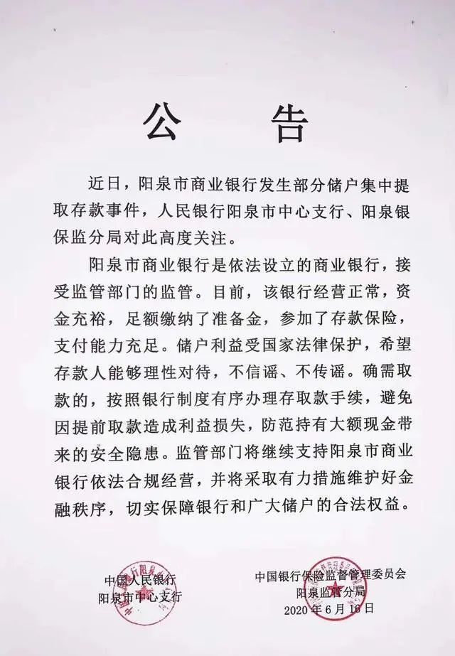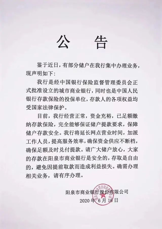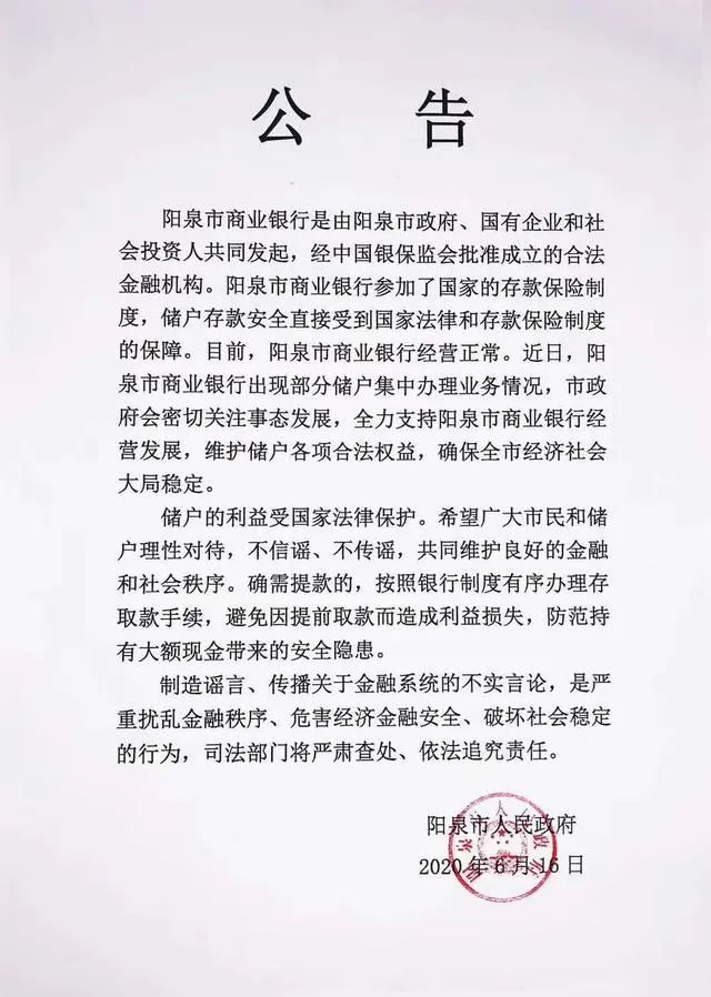 阳泉市政府在公告中表示,近日,阳泉商业银行出现部分储户集中办理业务情况,市政府会密切关注事态发展,全力支持阳泉商业银行经营发展,维护储户各项合法权益,确保全市经济社会大局稳定。储户的利益受国家法律保护。希望广大市民和储户能够理性对待,不信谣、不传谣。