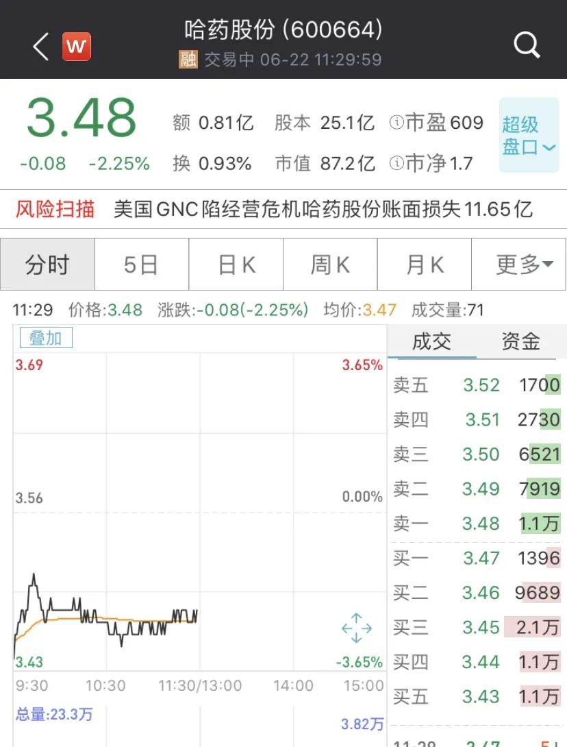 受上述消息影响,哈药股份今日低开3.65%,随后区间震荡,截至发稿,报3.48元/股,跌2.25%,最新总市值为87.2亿元。