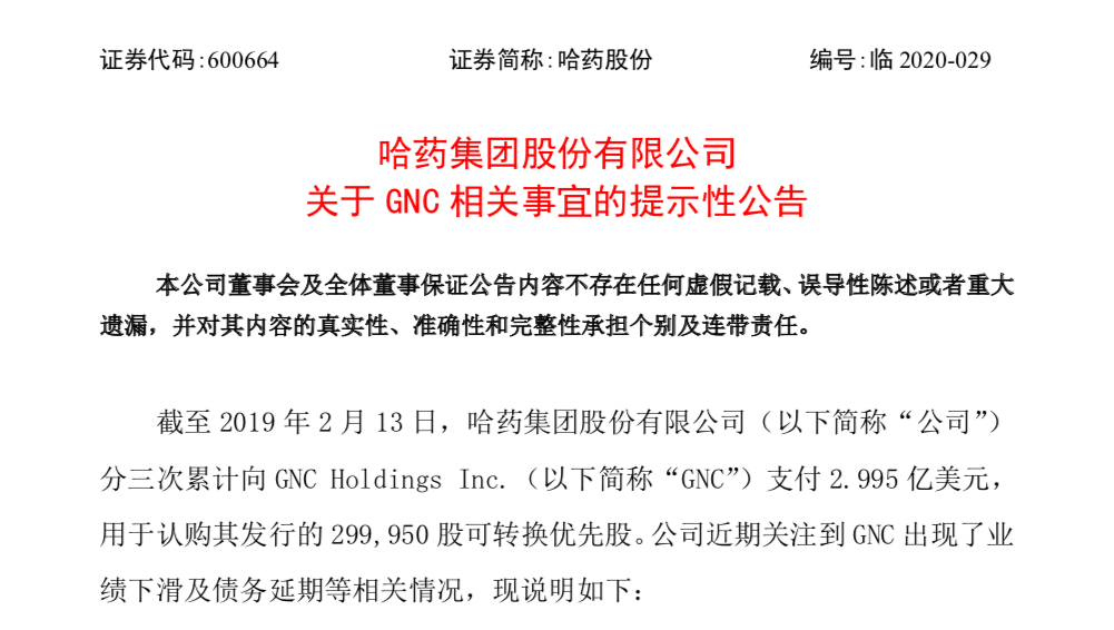 6月21日晚间,哈药集团发布公告称,截至2019年2月13日,公司分三次累计向GNC Holdings Inc.支付2.995亿美元,用于认购其发行的29.995万股可转换优先股。公司近期关注到GNC出现了业绩下滑及债务延期等相关情况,可能导致GNC的现金流受到较大影响。