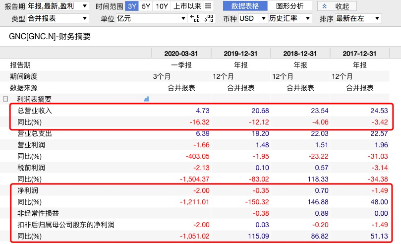 截至2020年5月6日,约40%(即1300家)位于美国和加拿大的所属GNC门店因政府的要求等原因而暂时关闭,且该等暂时关闭的门店中的一部分亦有可能在未来永久性关闭。GNC表示今年第一季度营收为4.73亿美元,比去年第一季度下降9220万美元,同比下降16.3%;净亏损2亿美元,同比大跌1211%;毛利润为1.37亿美元,比去年第一季度下降6640万美元,同比下降32.7%。