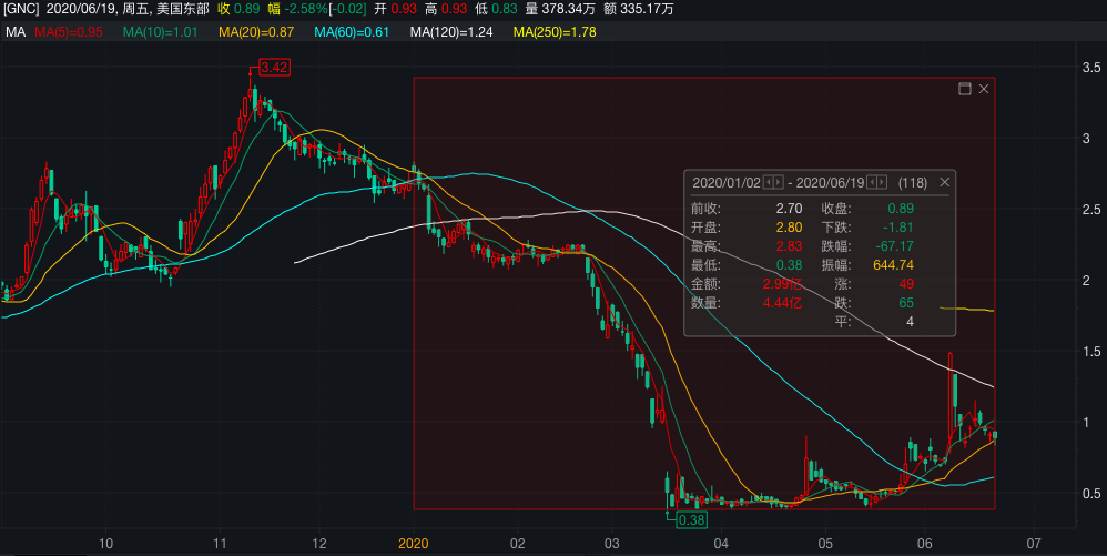 GNC的股价表现也“跌跌不休”,截至上周五(6月19日)收盘,年内跌幅超67%,市值蒸发1.6亿美元。当前报0.89美元/股,最新总市值为7500万美元。