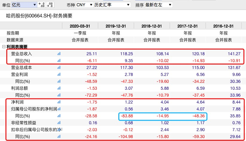 据年报披露,哈药集团2019年实现营业收入118.24亿元,同比增长9.35%,其中医药工业主营业务收入为34.55亿元,医药商业主营业务收入为83.15元,实现归属于上市公司股东的净利润为0.56亿元。