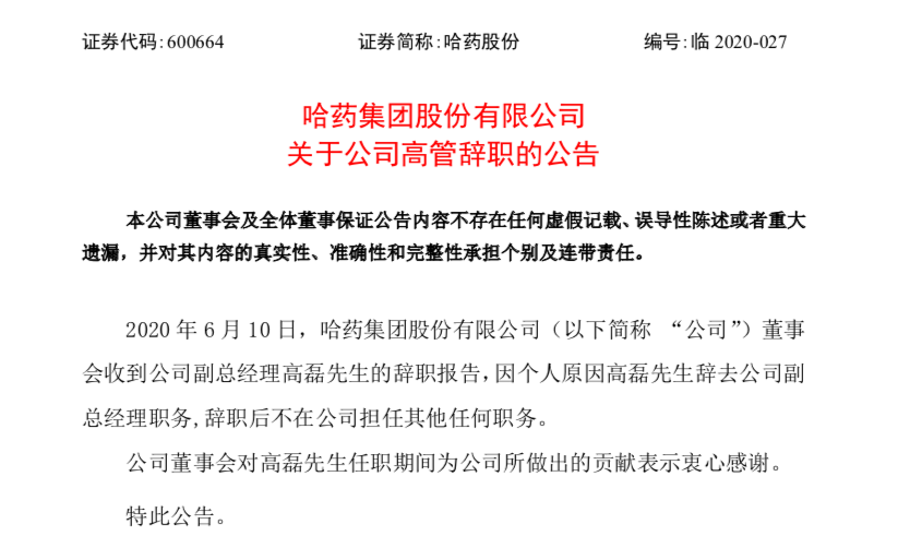 6月11日,哈药集团发布公告称公司董事会收到公司副总经理高磊的辞职报告,因个人原因高磊辞去公司副总经理职务,辞职后不在公司担任其他任何职务。资料显示,高磊担任副总经理的任期为2018年9月13日至2020年10月25日。