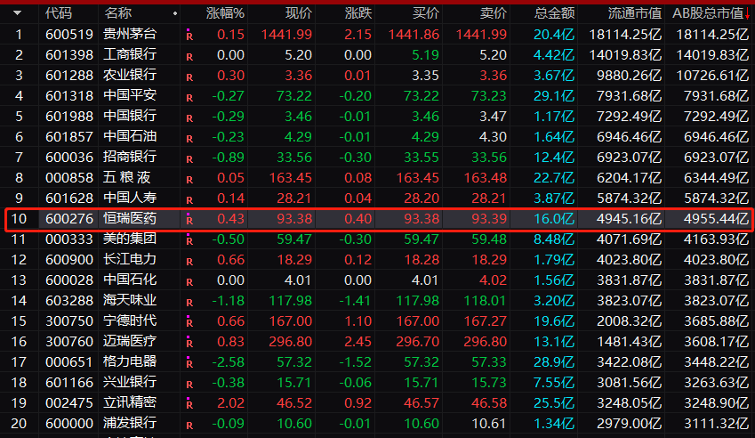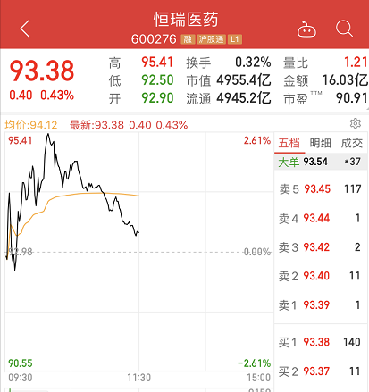 作为A股医药股市值一哥,恒瑞医药股价不断刷新新高,今日股价再创新高,市值突破5000亿元,今日早盘一度涨2.6%,截至上午收盘仍涨0.43%。今年以来,恒瑞医药的涨幅达到28.38%。