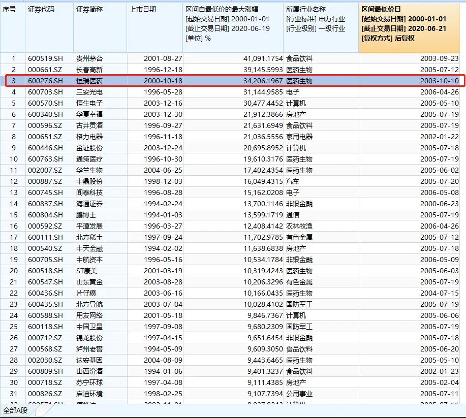 数据显示,2000年以来,已经有贵州茅台、长春高新、恒瑞医药、三安光电、恒生电子实现了300倍以上的涨幅,贵州茅台更是超过40倍,长春高新超390倍,恒瑞医药位居第三。消费、医药果然是出大牛股。
