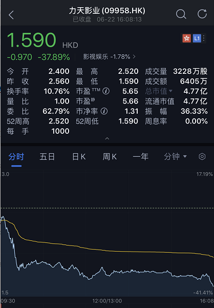 第一天上市就闪崩暴跌,6月22日,电视剧发行公司力天影业于港交所正式上市,但上市首日便破发,截至下午港股收盘时,股价下跌近40%。