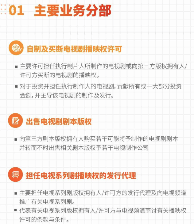 此外,公司也在从事包括:出售电视剧剧本、担任电视系列剧播映权的发行代理、投资公司担任非执行制片人的电视剧等业务。