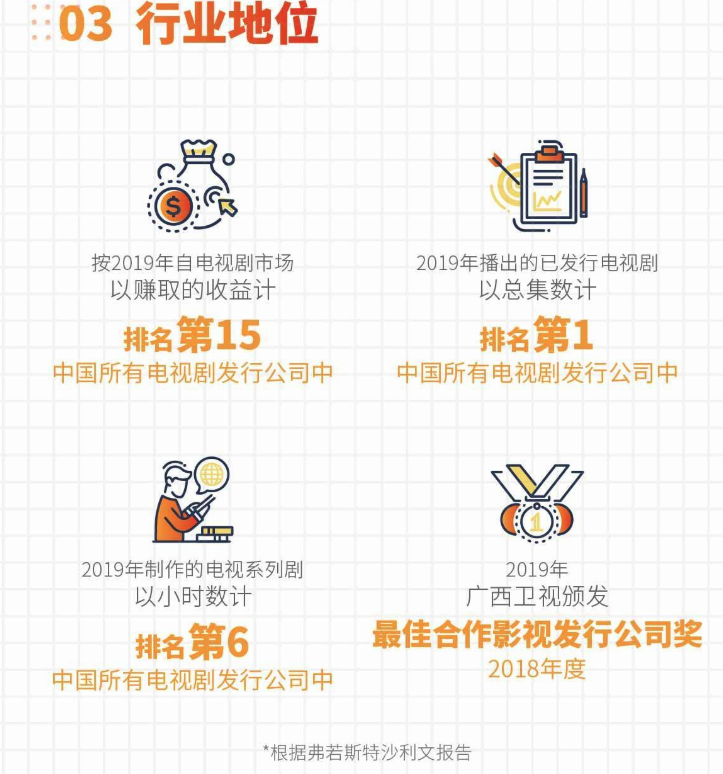 此前,弗若斯特沙利文报告曾指出,按照2019年自电视剧市场赚取的收益统计,在中国所有电视剧发行公司中,力天影业以约0.31%的市场份额排名第15。此外,按2019年播出的已发行电视剧总集数统计,在中国所有电视剧发行公司中,力天影业以约6.9%的市场份额排名第一。按2019年制作的电视系列剧小时数统计,在中国所有电视剧制作及发行公司中,力天影业则以约0.9%的市场份额排名第六。