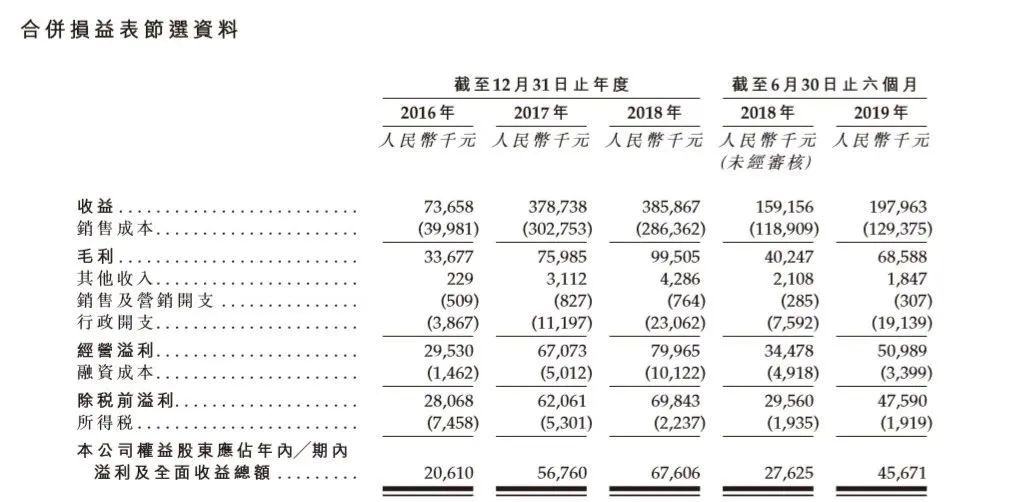财务数据来看,2016至2018年该公司收益分别为7366万元、3.79亿元和3.86亿元,复合年增长率达到128.9%;纯利分别为2060万元、5680万元和6760万元。