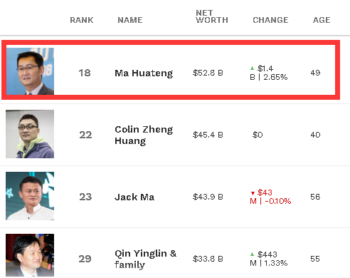 随着腾讯股价的暴涨,马化腾的身家也水涨船高,福布斯实时数据显示,目前马化腾身家高达528亿美元(约合人民币3736亿元),超出第二名黄峥近70亿美元。