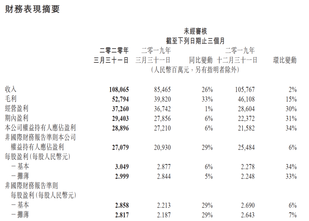 报告显示,2020年Q1腾讯营收1080.65亿,同比增长26%;净利润(Non-IFRS)270.79亿,同比增长29%,高于市场预期。