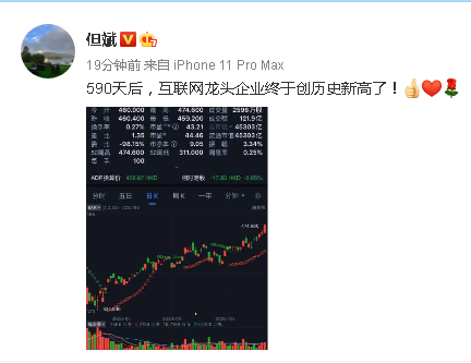 东方港湾董事长但斌也发微博庆祝:590天后,互联网龙头企业终于创历史新高了!