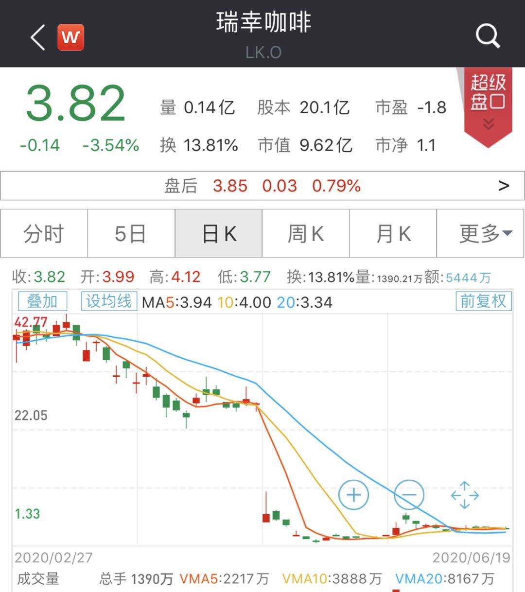 2020年5月21日,瑞幸咖啡复牌第二日,再跌28.72,目前市值仅6.78亿美元。