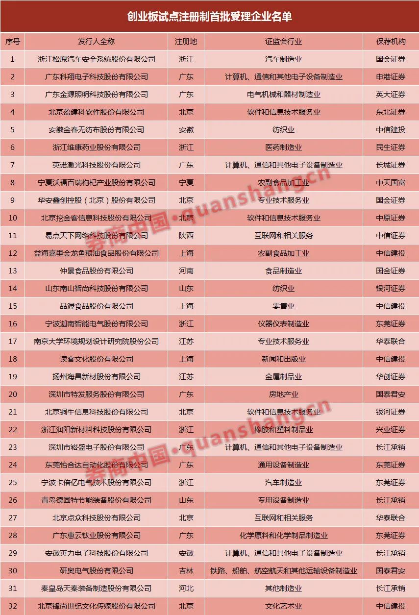 6月22日,创业板试点注册制首批IPO受理企业亮相,浙江松原汽车安全系统股份、广东科翔电子科技、广东金源照明科技、北京盈建科软件股份有限公司、安徽金春无纺布股份有限公司、浙江维康药业股份有限公司等32家公司拔得头筹。