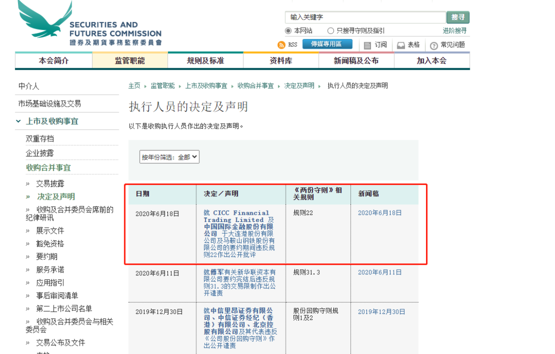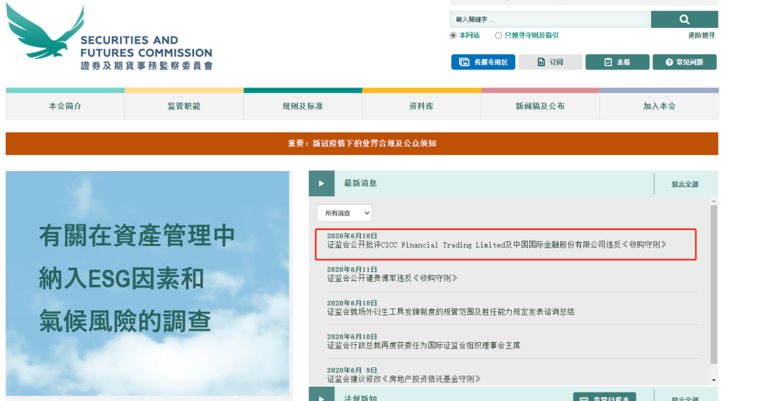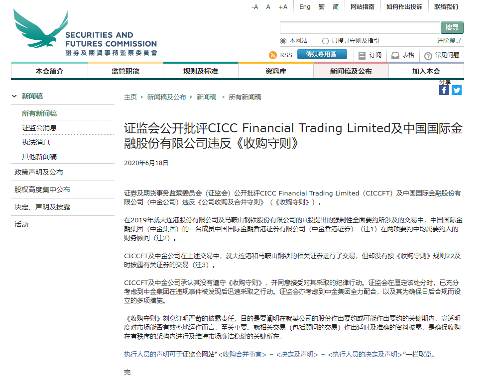 据香港证监会披露,2019年6月27日,中金香港证券的合规小组曾就对冲买卖的一般性质及《收购守则》规则22下的适用披露规定,咨询执行人员的意见,并知悉需对上述资料进行披露的情况。咨询执行人员后,CICCFT及中金公司立即主动汇报未遵守《收购守则》的情况,并于2019年6月28日提交了所有必须的披露资料。