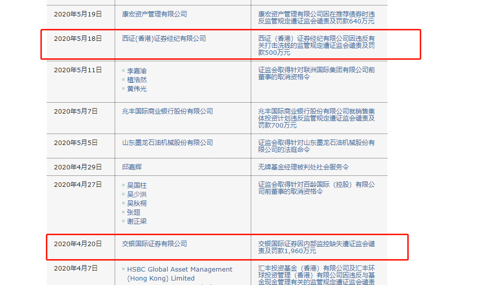 2020年4月,交银国际证券因内部监控缺失,包括在处理第三方资金存款及维持和实施保证金贷款和追收保证金政策方面的缺失,遭香港证监会谴责并罚款1960万元,系2020年以来香港证监会开出的最大罚单。