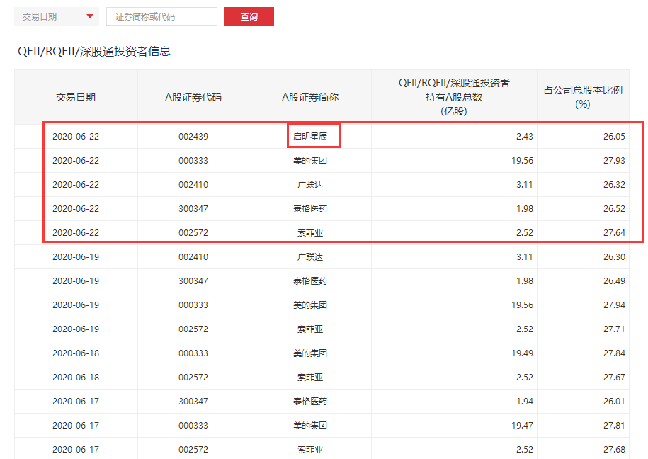 深交所网站披露的信息显示,截至6月22日,有5只股票的QFII/RQFII/深股通投资者持股比例超过26%,涉及股票具体为启明星辰、美的集团、广联达、泰格医药、索菲亚。